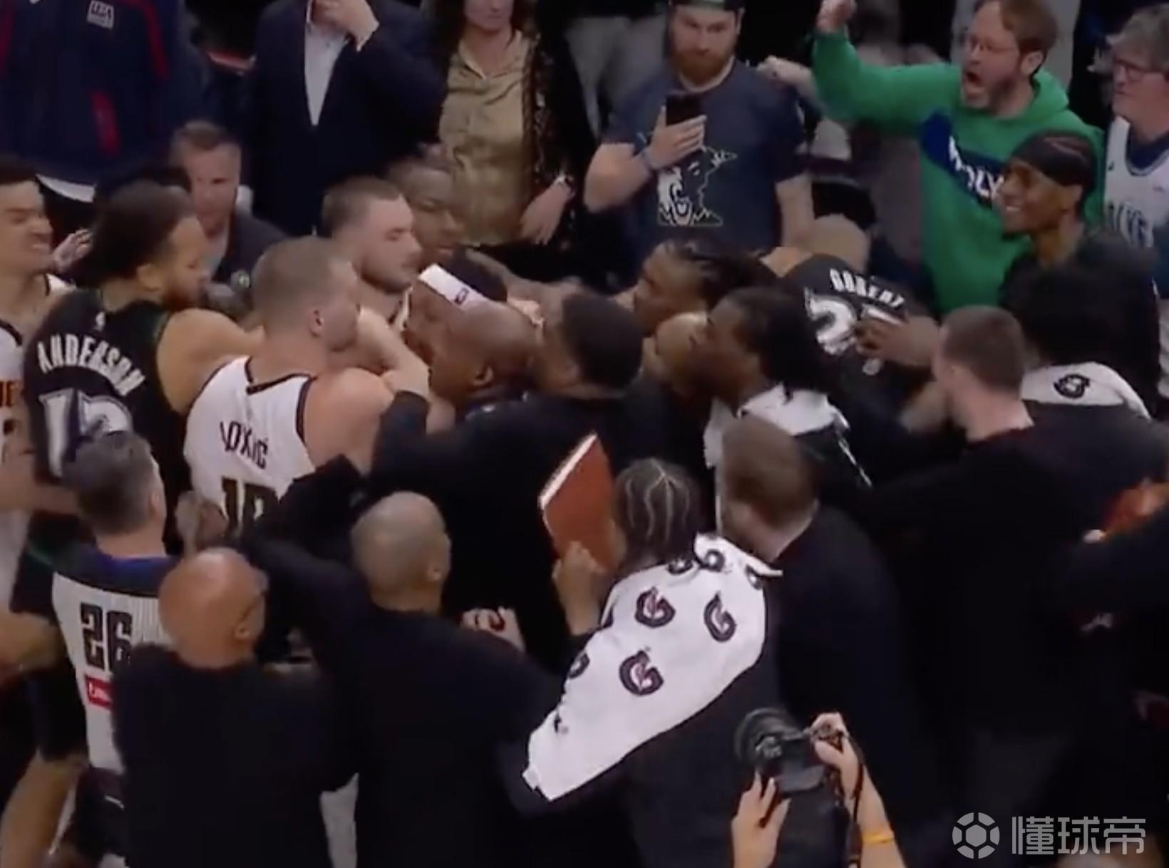 最后时刻,森林狼大比分领先的情况下,麦克丹尼尔斯上了一个空篮,引发约基奇不满,他从后场直接冲向麦丹,随后引发大规模冲突,约基奇和麦丹两人均被驱逐。