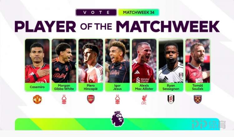 英超官方列出了第34轮比赛最佳球员候选名单,卡塞米罗、因卡皮耶、麦卡利斯特在列。